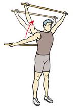 Para este ejercicio necesitamos un palo largo, o una cinta elástica (preferiblemente). Cogemos la cinta por los extremos y extendemos los hombros y codos un poco más ancho de los hombro, quedando los brazos delante del tronco. Desde esta posición tenemos que tratar de llevar la cinta a la espalda. Lo hacemos despacio, controlando el movimiento. Ejercicio muy bueno para calentar.