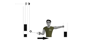 Igual que el ejercicio anterior, pero esta vez la rotación se lleva hacia afuera. Por lo tanto, la polea tendrá que pasar por enfrente del tronco. No olvidamos la respiración y hacer el ejercicio lentamente sintiendo cómo trabajan los rotadores del hombro.