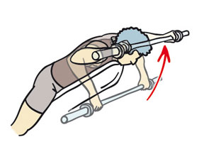 Nos colocamos como vemos en la imagen. Tratamos de que el codo del brazo que va a trabajar esté lo más pegado posible al tronco. Soltamos aire mientras llevamos la polea hacia nosotros y cogemos aire volviendo a la posición inicial controladamente.