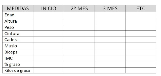 Una vez tengamos todos los resultados, los podemos ir anotando en una tabla como ésta, y así llevaremos nuestro seguimiento. Además de esto, también es recomendable anotar los pesos que vamos levantando, asií como las distancias de carrera etc. Cuantos más datos tengamos mejor nos irá, mayor control tendremos de nuestro entrenamiento y más motivados estaremos. Hacer todo esto no sirve de nada si no tenemos un entrenamiento planificado y una dieta correcta, por lo que es de vital importancia hacer las cosas bien.
